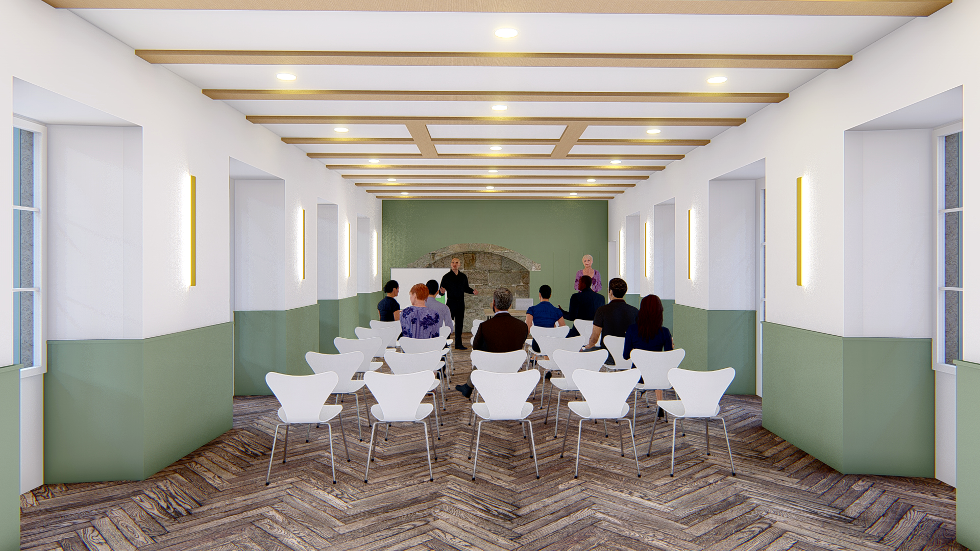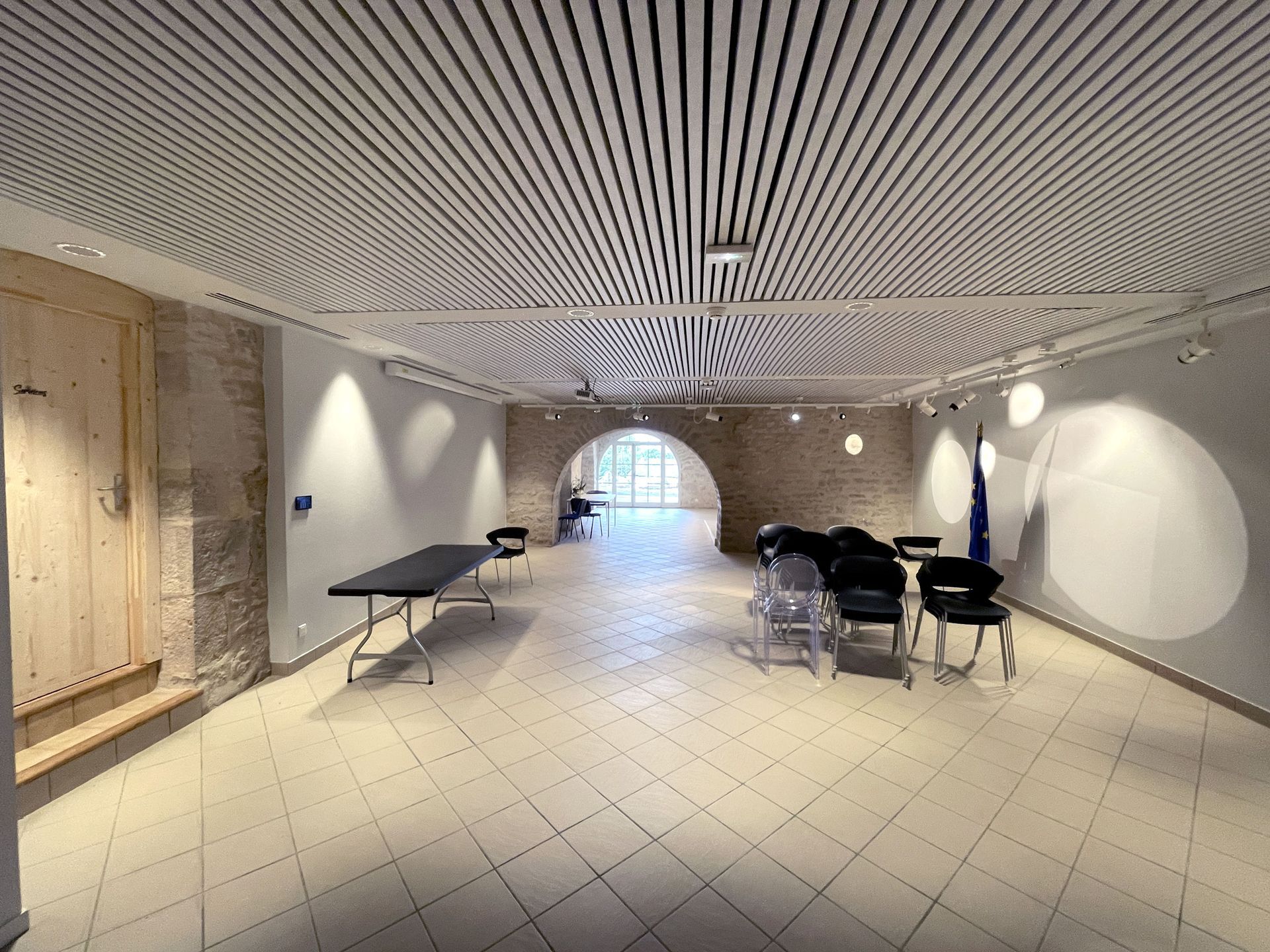 Un espace de transition, pour les élus, est aménagé à l’entrée de l’espace arrière d’accueil. On y trouvera boîtes aux lettres, informations et 3 postes de travail. Un espace détente sera créé, avec une salle de réunion dans le local en fond de salle du conseil.