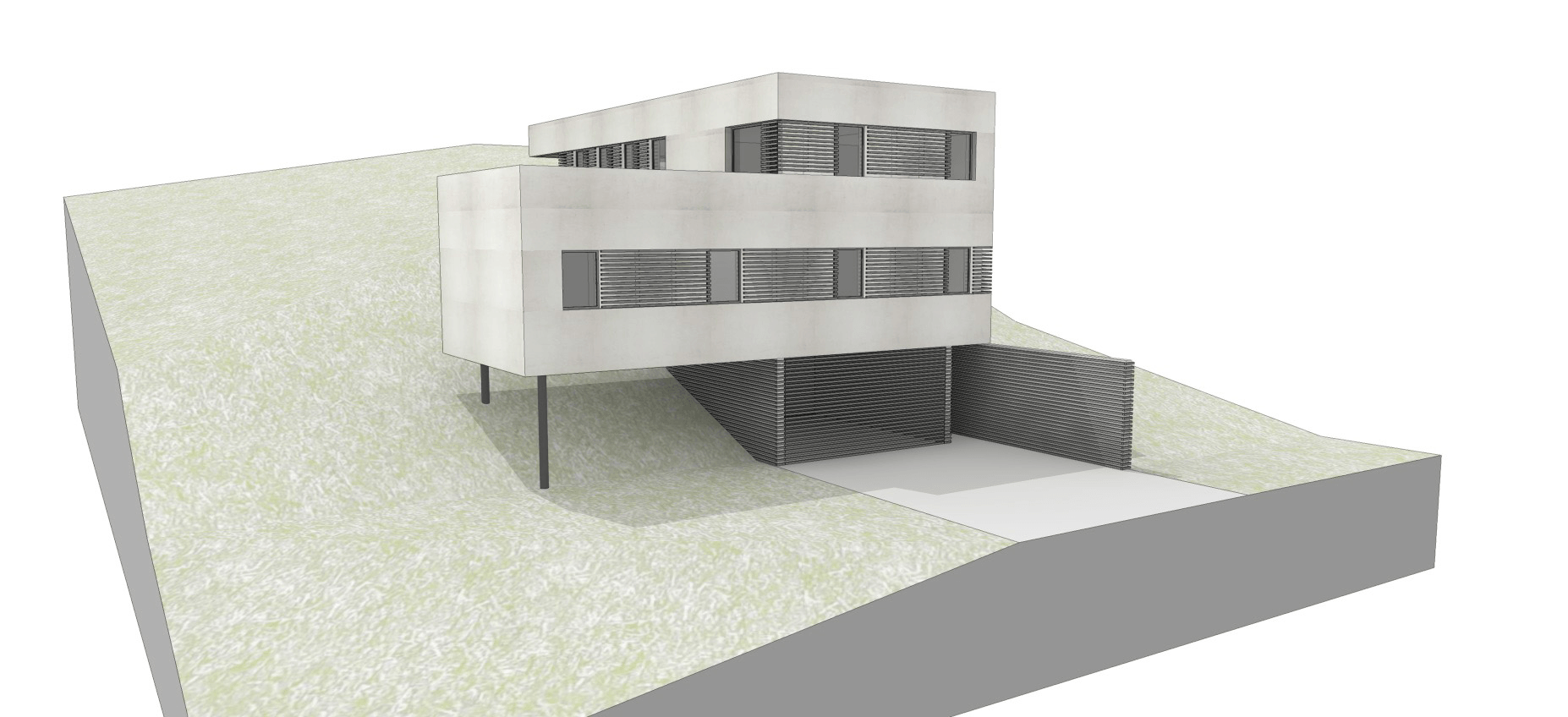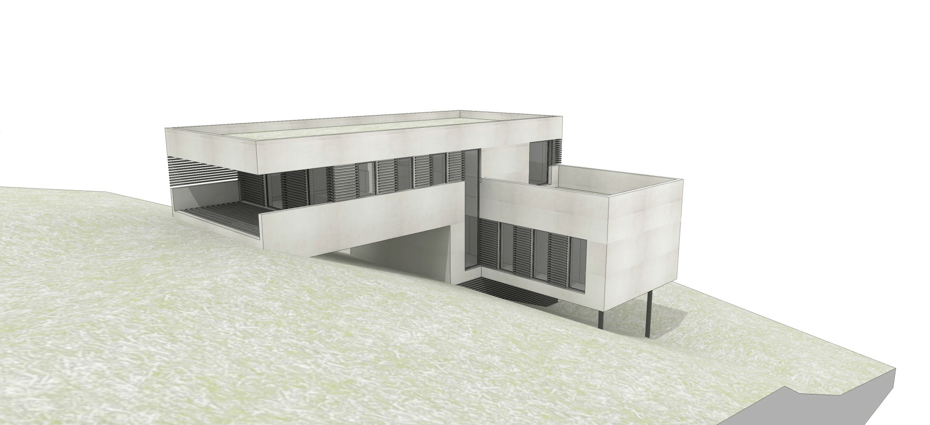 Le garage est le premier rapport au sol et supporte l’étage des chambres et, pour moitié, des pilotis laissent glisser le sol naturel sous la maison.
