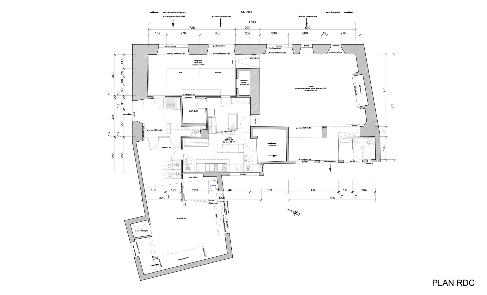 Le « Cantou » sera préservé et valorisé, le bois sera un matériau omniprésent. Les connexions visuelles entre le restaurant, le bar et la terrasse en structure bois par un accès vitré donneront une impression d’espace. Les pièces annexes telles que la cuisine professionnelle, les locaux techniques, chambres froides ainsi que l’atelier seront reliées entre elles par des accès facilités et rénovés selon les normes d’hygiène en vigueur. De plus, l’atelier aura une fonction de point d’attraction au cœur du village lors de rassemblements festifs.